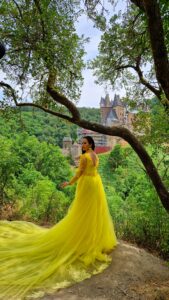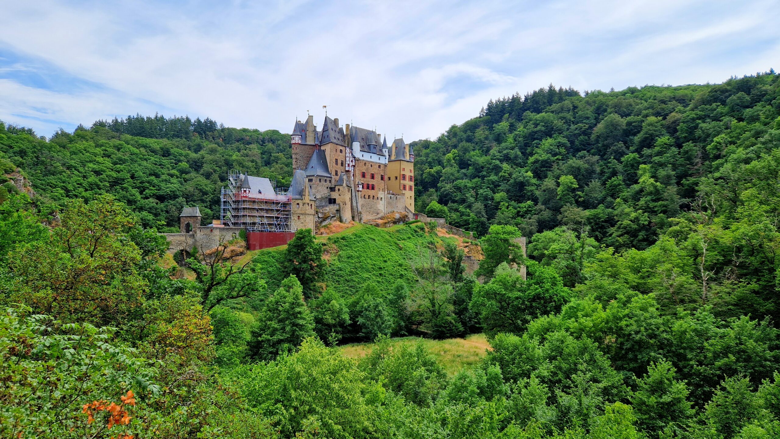 Wir stiegen weiter bergauf und nach knapp 5 km erblickten wir in der Ferne erstmals die märchenhafte Burg Eltz. In 500 Jahren Baugeschichte flossen hier Baustile von der Romantik bis zum Barock ein. Bei ihr handelt es sich um eine Randhausburg mit acht um einen Hof gruppierten Fachwerktürmen. Die Grafen von und zu Eltz sind seit 800 Jahren die Eigentümer der Burg, wobei der jetzige Graf Jakob von und zu Eltz-Kempenich ein weltbekanntes Weingut in Eltville unterhält. Es bleibt festzuhalten: diese einstige Ritterburg wurde nie erobert und befindet sich daher noch in einem hervorragenden Zustand. Sie gehört zu den schönsten Burgen in Deutschland und zierte einst als eine der populärsten Burgen den 500,- DM-Schein.