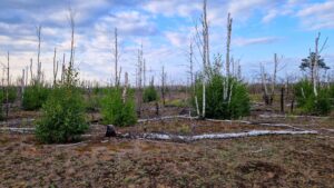 Auf wunderschönen Waldwegen erreichten wir einen weiteren großzügig angelegten Rastplatz, wo wir uns ausgiebig stärkten. Kurz darauf durchwanderten wir ein riesiges Waldbrandgebiet, das bereits zweimal in diesem Jahr für Aufsehen und Schrecken sorgte. Und in der Tat: Beidseits des Weges fanden sich verkohlte Erden, verkohlte Baumstämme, umgestürzte oder abgebrochene Bäume. Eine Landschaft wie nach einem Bombenangriff. Trotzdem ist es immer wieder erstaunlich, wie sich schon in kurzer Zeit die Natur erholt und ein neuer Lebensraum entwickelt.