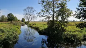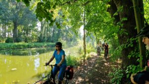 Über Potsdamer- und Berliner Straße näherten wir uns der Wuster Straße, bogen links in sie ab und umfuhren somit einen Teil der vom Verkehr stärker frequentierten B1. Vor der Brücke über den Emster Kanal ging es erneut nach links auf einen schmalen, verwunschenen und naturbelassenen Single Trail parallel zur Emster. Kurz vor dem Feuchtgebiet an der Krummen Havel überquerten wir den Kanal und gelangten auf den Weg „Havelufer“, dem wir bis zum Schloss Gollwitz, einer heutigen Begegnungsstätte für unterschiedliche Kulturkreise und Religionen, folgten.