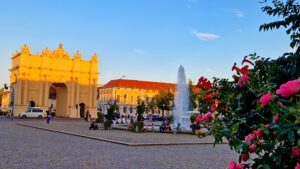 Am 68 m hohen Reiherberg entlang kamen wir zur baumgesäumten Lindenallee, einer Sichtachse, die schnurgerade auf das Neue Palais zuführte. Im Park Sanssouci wählten wir den für Fahrräder freigegebenen Ökonomieweg, der uns vorbei am Chinesischen Haus führte. Über den Weg „Am Grünen Gitter“ verließen wir den Park und fanden uns kurz darauf auf dem Luisenplatz mit seiner sprudelnden Wasserfontäne und dem von der untergehenden Abendsonne angestrahlten Potsdamer Brandenburger Tor ein.