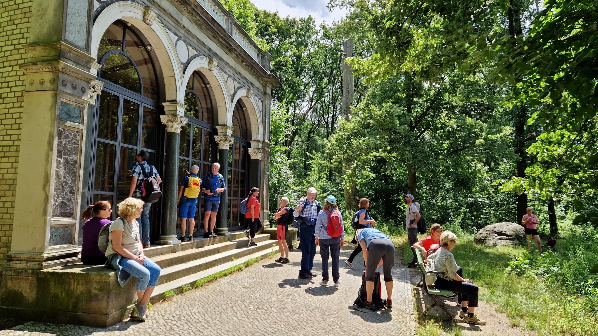 Nach dem Wechsel der Havelufer kamen wir zum Hans-Otto-Theater und weiter zum Heiliger See und der Gotischen Bibliothek. Am Marmor Palais kam dann die Gruppe überein, den ursprünglich geplanten Weg über Alexandrowka, Kapellenberg und Belvedere auf dem Pfingstberg auszuklammern und auf ein andermal zu verschieben. Durch das Wandern in der welligen Landschaft des Gienicker- aber auch Babelsberger Parkes machte sich bei den meisten eine gewisse Müdigkeit in den Beinen bemerkbar.