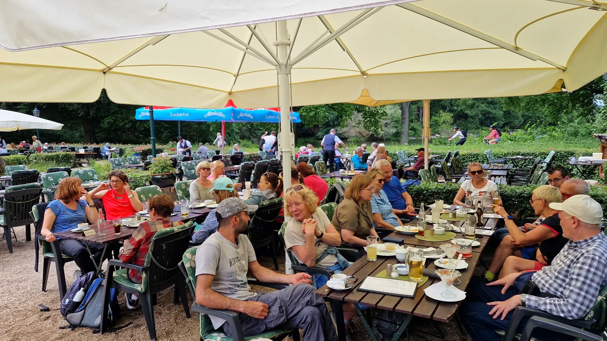 Durch den Park Glienicke, auch kurz Glienicker Park genannt, ‚arbeiteten‘ wir uns vorbei an Wegsperrungen und Umleitungen, die wegen Astbruchgefahr zuhauf angelegt wurden und dieses Gebiet schon weiträumig zu einer Art No-Go-Area machen, hinab zum Wirtshaus Moorlake. Hier kehrten wir im Garten am Wasser der ‚Glienicker Lake‘ ein und ließen uns von der sehr freundlichen Bedienung kulinarisch verwöhnen.