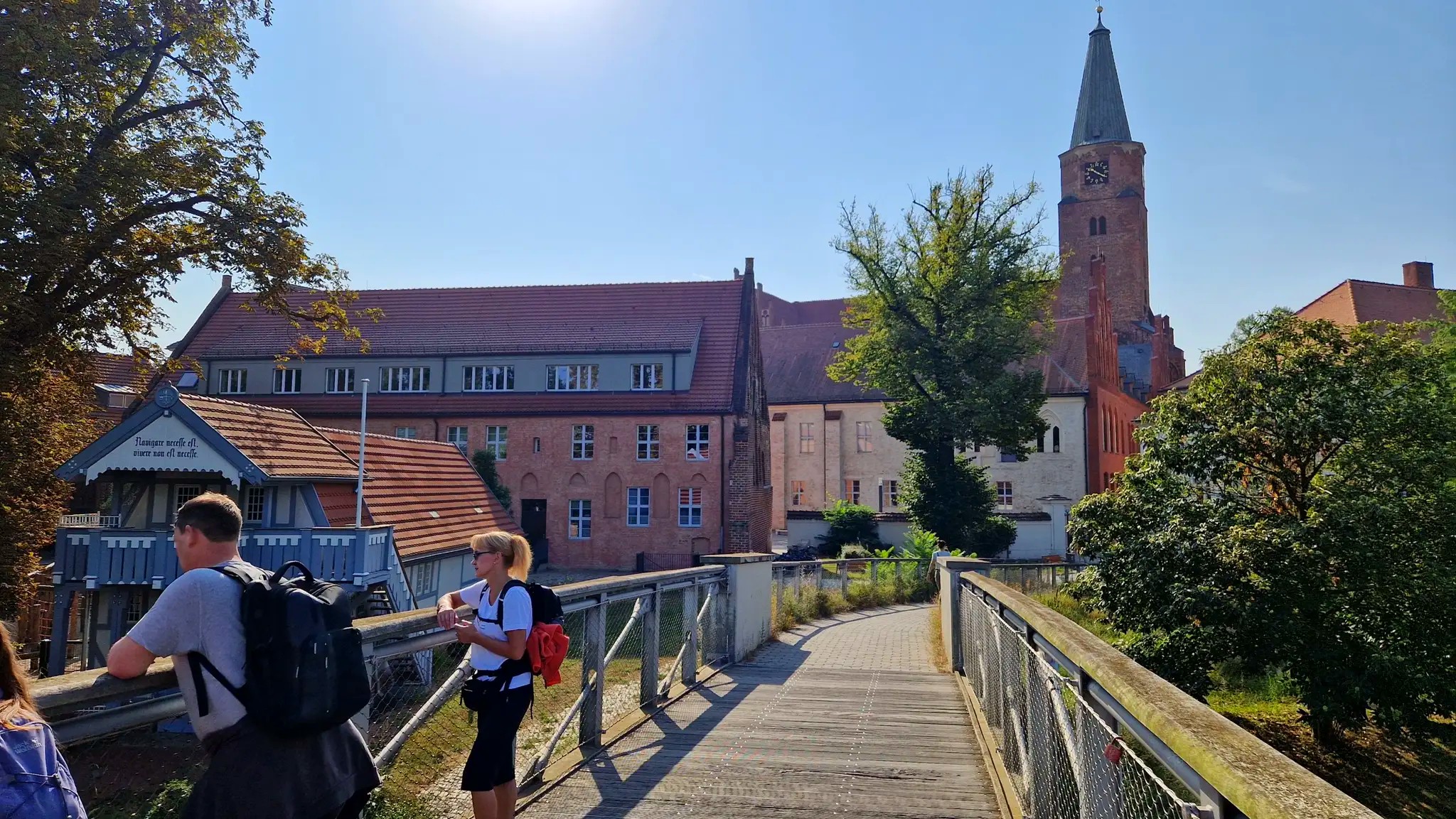 Rechts und links neben dem knapp 29 m hohen Neustädter Mühlentorturm begegneten uns weitere drollige Waldmöpse. Hier konnten wir einen herrlichen Blick über den sich in einer Ausbuchtung verlaufenden, recht breiten Stadtkanal und dem sich dahinter präsentierenden Dom St. Peter und Paul werfen und begaben uns auf einen weit ins Wasser reichenden Steg mit Pavillon.