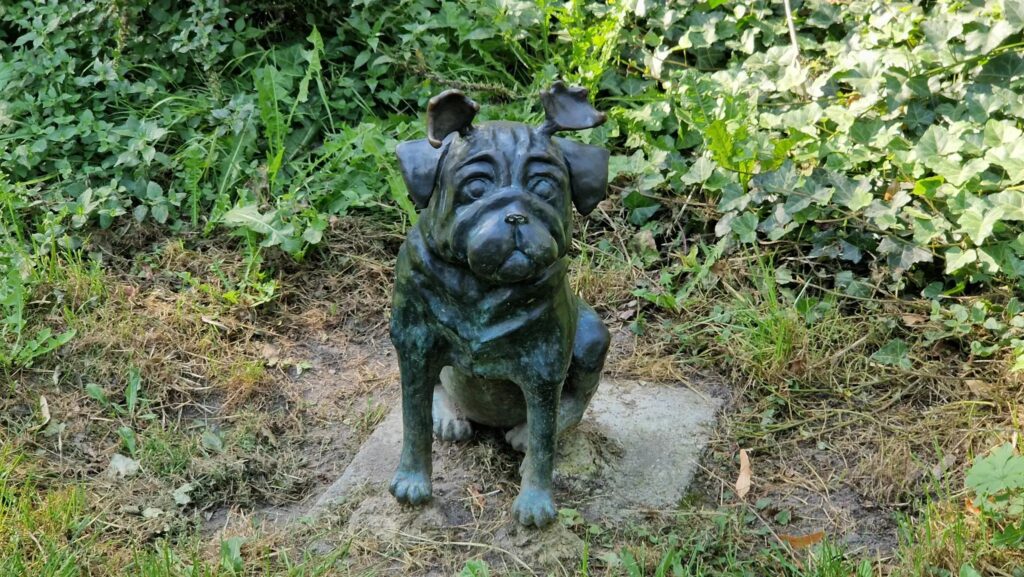 Wir umrundeten den ‚Packhof‘ entlang am Triebwerkskanal und der Brandenburger Niederhavel, die wir über die Jahrtausendbrücke querten, um vorbei an der Kirche St. Johannis in den Humbodthain mit seiner großen Waldmops-Parade zu gelangen. Am Plauer Torturm ging es vorbei zu unserem nächsten Ziel: Das Altstädtische Rathaus mit seinem Roland. Vor dem Rathaus befindet sich ein weiteres Fotomotiv. An einem Brunnen richtet sich diesmal ein possierlicher Mops auf, als wolle er aus dem Brunnen saufen. Wie seine Artgenossen ist er etwa 50 cm groß und aus Bronze gegossen. Nicht wenige von ihnen fanden leider neue „Besitzer“.