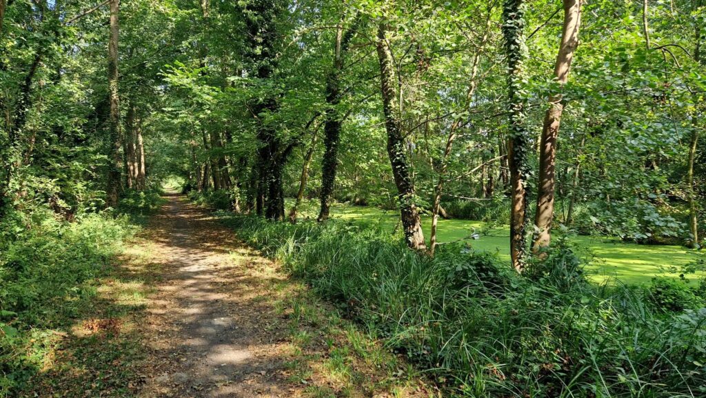 Hinter Klein Kreutz führte der Weg weiter Richtung Saaringen durch den ‚Grünen Tunnel‘, der uns den ersehnten Schatten für kurze Zeit spendete. Dieser Weg verläuft auf der ehemaligen Bahntrasse der Westhavelländischen Kreisbahnen und verband einst die Ortschaft Roskow mit Brandenburg. Heute führt dort ein schmaler Weg entlang eines grünen Fließes, umrahmt von einem ebenso tunnelartigen Grün.