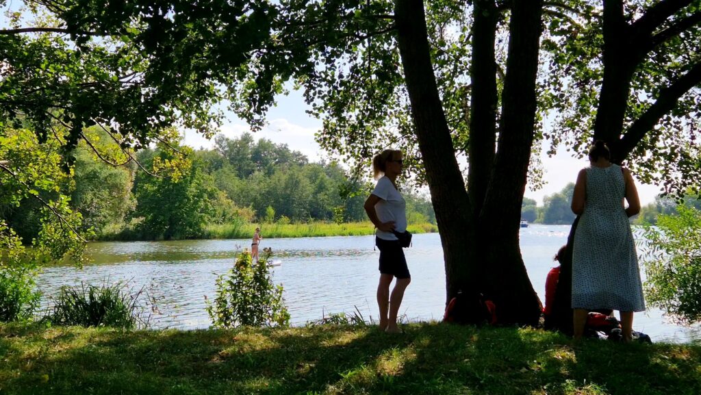 Als willkommener Rastplatz diente hier der mit Bäumen beschattete Spielplatz des Ortes, dem eine wunderschöne Badebucht vorgelagert ist. Wir füllten den Flüssigkeitsbedarf mit dem Rest unserer mitgeführten Getränke wieder auf und einige Wanderinnen kühlten sich im Havelwasser die Füße. Nach einem Studium der Busanbindungen kam die Gruppe überein, die noch restlichen vier Kilometer bis Weseram aufgrund der extremen Wetterlage sich zu schenken.