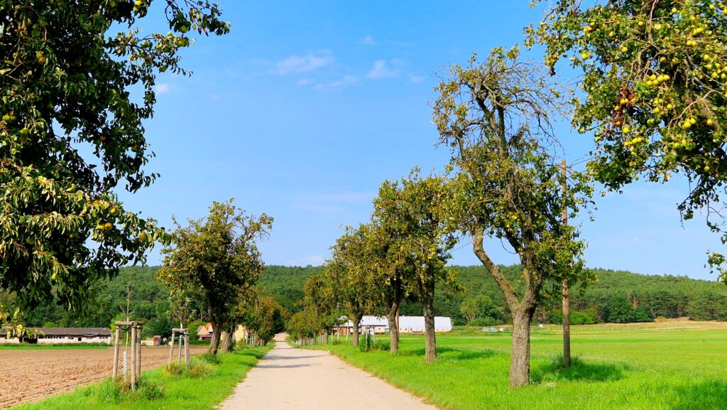 Über die mit prachtvollen Obstbäumen gesäumte Schulstraße nahmen wir Kurs in Richtung Götzer Berge. Beim Anstieg machten sich bei mir dann die 30°, trotz beschattetem Weg, doch ‚nachhaltig‘ bemerkbar. Deshalb ersparte ich mir dieses Mal die Besteigung des Aussichtsturmes und überließ dies der fitteren Wandergruppe…