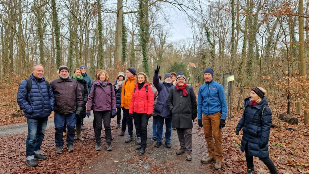 Mit kurzer Verspätung, da einige Wanderfreunde im Verkehr stecken blieben, begrüßte ich immerhin 19 Wanderbegeisterte auf dem Weg zum Böhmischen Weihnachtsmarkt. Wir überquerten die Potsdamer Chaussee um die vis-á-vis gelegenen Treppenstufen zu erklimmen. Der Weg führte uns zur Revierförsterei Dreilinden, die wir linkerhand liegen ließen.