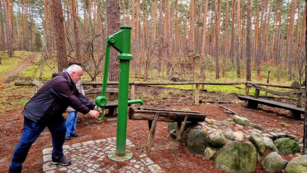 Auf dem Kurfürstenweg ging es gut voran. Nach ca. 400 m verließen wir ihn und bogen nach rechts, vorbei am Tatarenteich, in Richtung Kneippweg ab. Nach knapp einem Kilometer kam der Kneippbrunnen in Sicht. Anders als bei komoot oft beschrieben, förderte die örtliche Pumpe tatsächlich Wasser. Unser Wanderfreund Olaf musste nicht lange pumpen, um das Grundwasser nach oben zu befördern. Hier kann man in warmen Sommermonaten seine heiß gelaufenen Füße im Brunnen hervorragend kühlen…