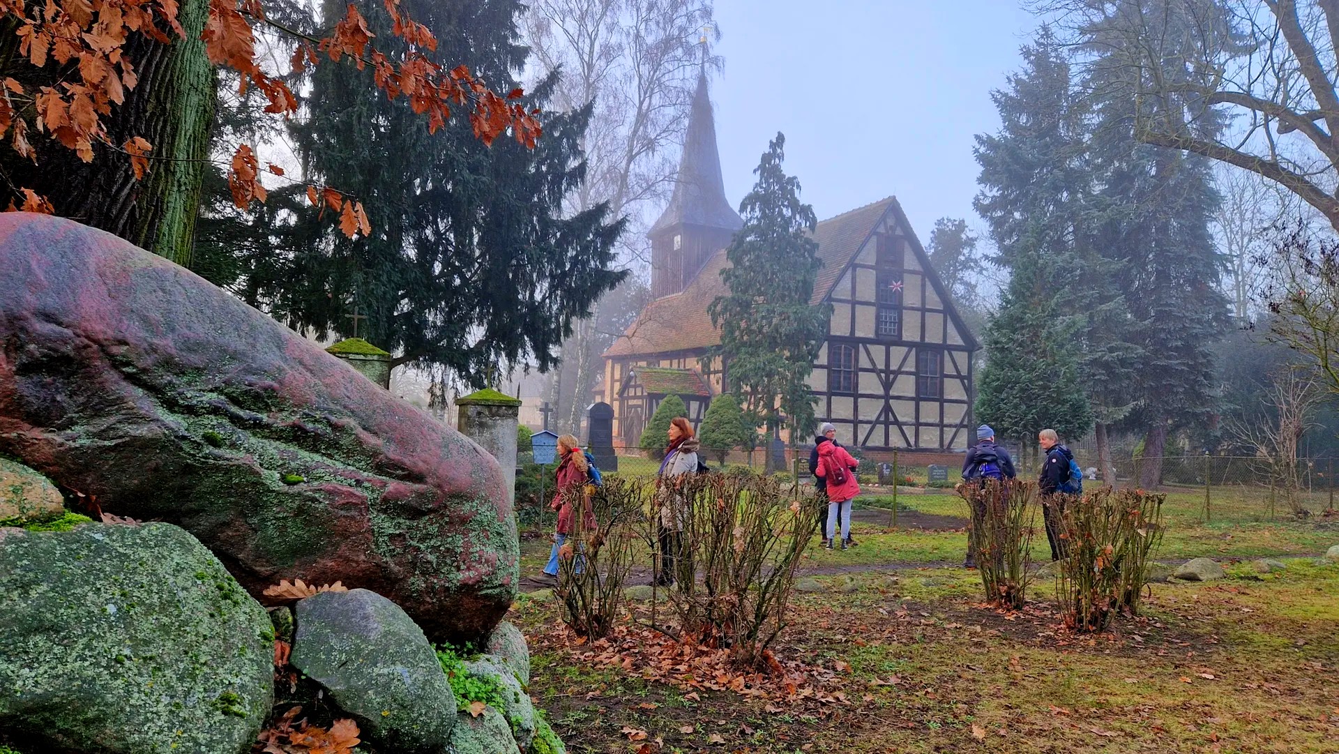 Über einen abenteuerlichen Pfad unterquerten wir parallel zum Pelsterlakegraben in gebückter Haltung einen teilweise unter Wasser stehenden Tunnel der Lehrter Bahn und wandten uns dann der kleinen Ortschaft Wernitz zu. Dabei durchbrach langsam die Sonne die immer noch vorhandenen Nebelschwaden, was sehr mystische Landschaftsbilder erzeugte. Der Ort Wernitz war lange mit der Familie von Bredow verknüpft und ein Brand zerstörte 1849 einen Großteil des Dorfes.