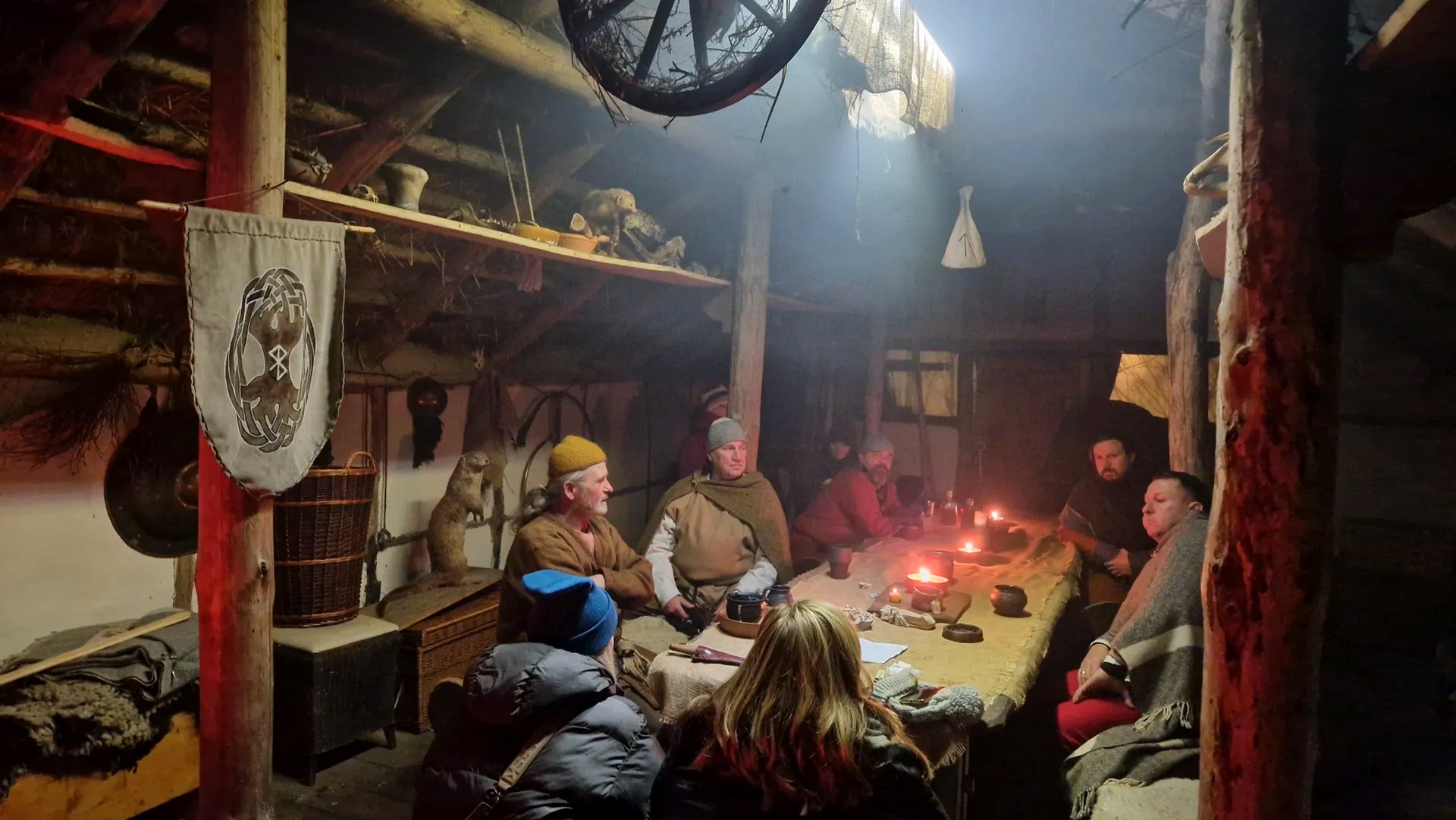 Pünktlich um 17:00 Uhr betraten wir das in Nebel gehüllte und nachtschwarze Gelände vom historischen Semnonendorf Gannahall. Es legte sich langsam eine mystische Stimmung über das Semnonendorf. Immer mehr ‚Gewandete‘ traten aus der Dunkelheit hervor. Wie ich erfuhr, ist das der Terminus für Vereinsmitglieder, die in möglichst detailgetreuer Kleidung zur Festlichkeit erscheinen. Gut eintausend Jahre waren die Semnonen die unumstrittenen Herren zwischen Elbe und Oder, von der Ostseeküste bis zu den Mittelgebirgen. Über Jahrhunderte hinweg war dies das „heilige Land“ aller semnonischen Abkömmlinge, egal ob sie dem Volk der Hermunduren, Markomannen, Quaden oder Allamannen angehörten.