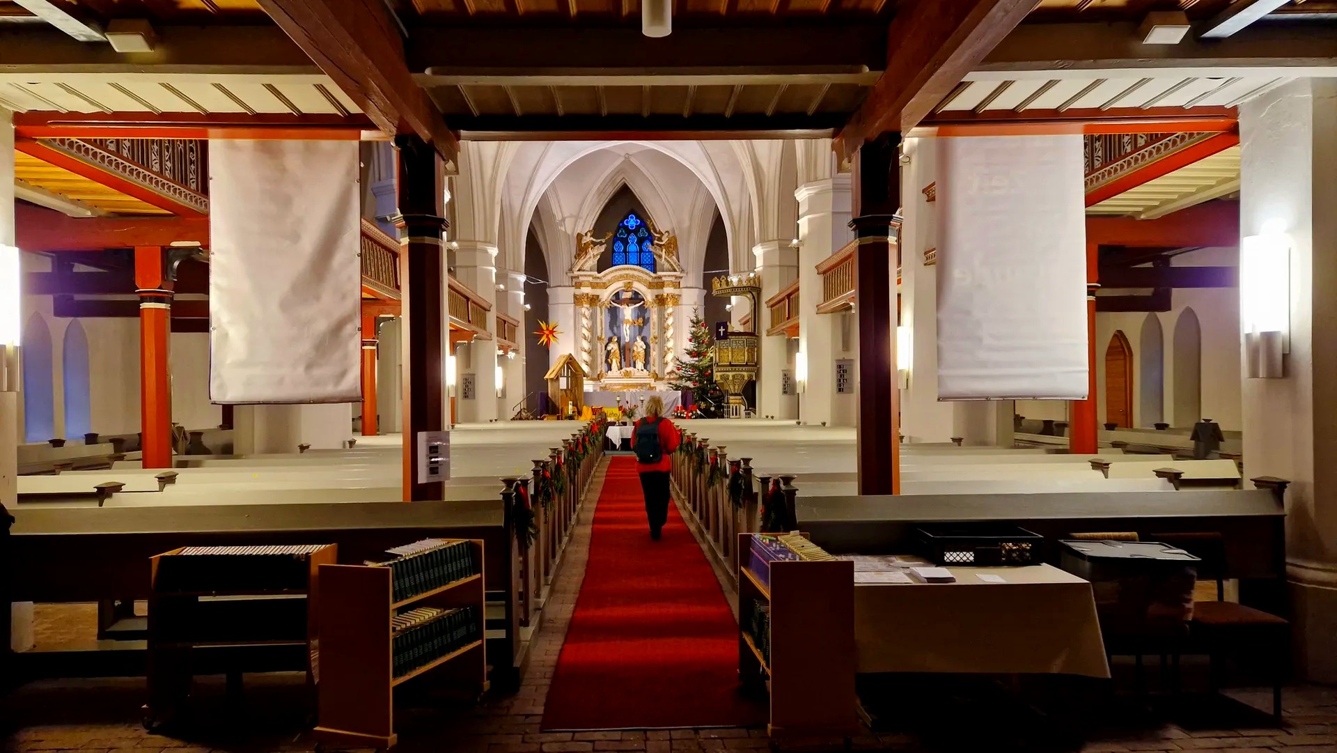 Vorbei am 1891 in norddeutscher Backsteingotik errichteten Rathaus, indem der Bürgermeister einst zehn Prozent seines Verdienstes als Miete für seine Wohnung entrichten musste, gelangten wir zur Stadtkirche St. Jacobi. Sie ist eines der ältesten Bauwerke in Nauen. Ihr Glockenturm weist heute noch die Spuren eines Brandes von 1695 auf. Wir hatten Glück und konnten uns im imposanten Kirchenschiff etwas aufwärmen und die Zeit bis zur Eröffnung des Jul-Festes überbrücken.