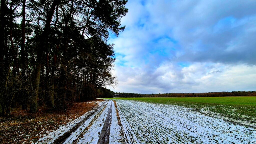 Auf dem Weg nach Stücken klarte sogar der Himmel ein wenig auf und die Nachmittagssonne spiegelte sich in den Pfützen. Sanft gewellte Äcker und kleine Waldstücke begleiteten uns nun zum Ausgangspunkt zurück, den wir pünktlich und zufrieden erreichten – mit dreckigen Schuhen, roten Wangen und einem Hauch von Frühling in der Luft.