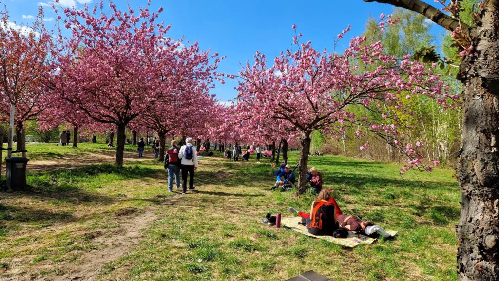 Im sogenannten Dreiländereck, wo Berlin-Lichterfelde sowie die Brandenburger Landkreise Teltow-Fläming und Potsdam-Mittelmark zusammentreffen, konnten wir uns heute über einen besonders spektakulären Anblick der Kirschblütenallee erfreuen. Sie ist eine der längsten Kirschblütenalleen von Berlin-Brandenburg, mit über 1000 in rosa Farben aufgeblühten Japanischen Kirschbäumen. Ganz wie es in Japan zelebriert wird, schlugen wir unsere mitgebrachten Decken auf und picknickten unter den Bäumen, bevor die Heimfahrt angetreten wurde.